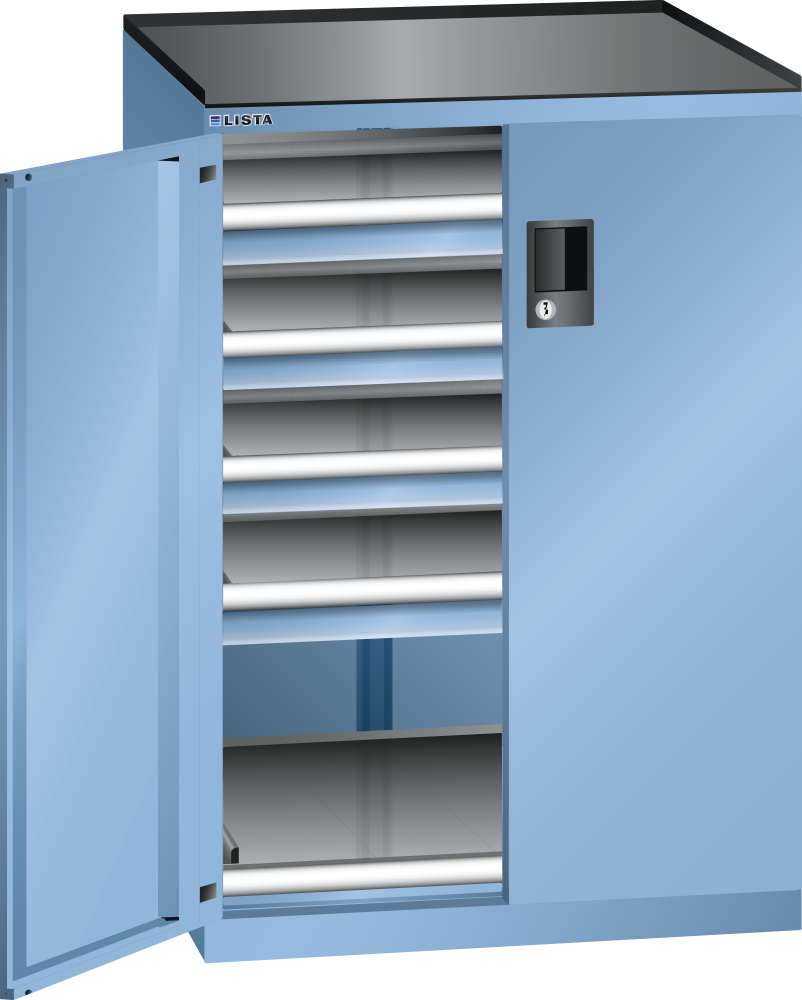 Drawer cabinet with hinged doors 36x36E (WxDxH) 717x753x1020mm 4 drawers (200kg), 1 pull-out shelf (200kg) RFID Lock Light blue RAL 5012