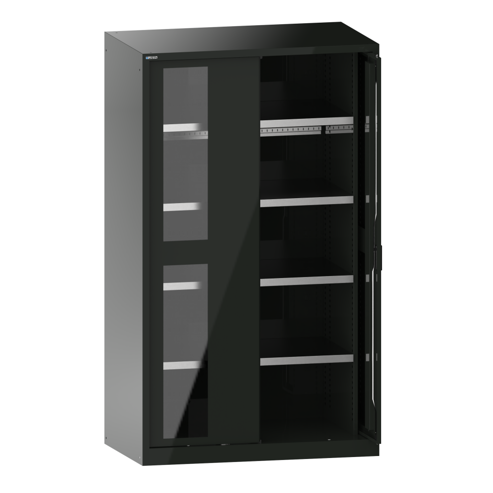 Heavy-duty cabinets with retracting doors: The cabinets are fitted with: adjustable shelves, galvanised, 33 mm thick, pull-out shelves and drawers, painted, generally grey, NCS 4502-B. Retracting doors folded from one piece, optionally either in solid sheet or with viewing windows. Fitted in hinge brackets, retracting range 90°, projection of doors when opened is 85 mm. Anti-tilting is ensured by the single-drawer blocking system. KEY, CODE or RFID locks available.