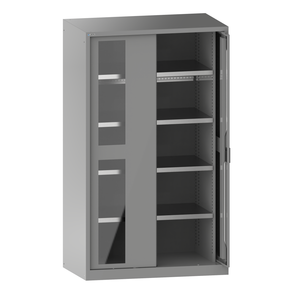 Heavy-duty cabinets with retracting doors: The cabinets are fitted with: adjustable shelves, galvanised, 33 mm thick, pull-out shelves and drawers, painted, generally grey, NCS 4502-B. Retracting doors folded from one piece, optionally either in solid sheet or with viewing windows. Fitted in hinge brackets, retracting range 90°, projection of doors when opened is 85 mm. Anti-tilting is ensured by the single-drawer blocking system. KEY, CODE or RFID locks available.