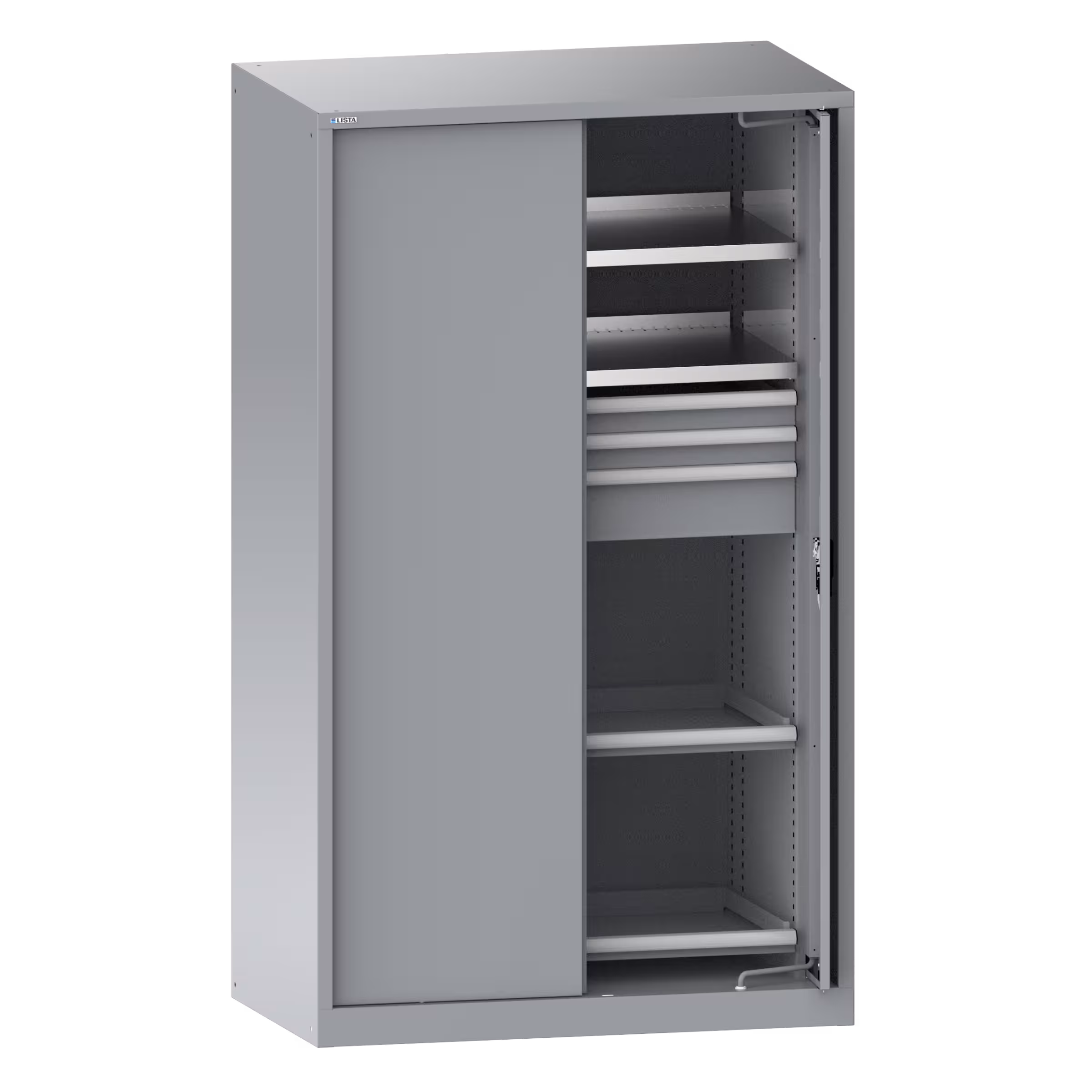 Heavy-duty cabinet with 2 solid sheet retracting doors 54x27E (WxDxH) 1146x690x1950mm 2 shelves, 3 drawers, 2 pull-out shelves KEY Lock Pigeon grey NCS S 4502-B