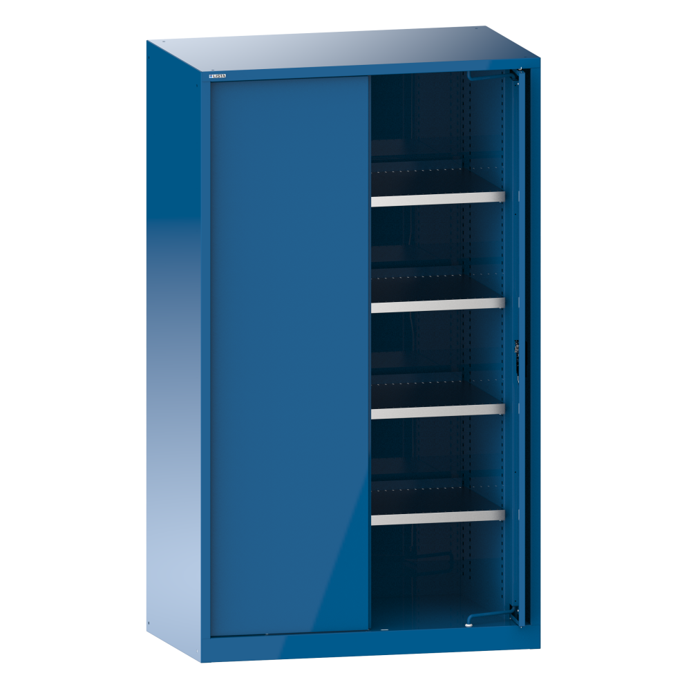 Heavy-duty cabinet with 2 solid sheet retracting doors 54x27E (WxDxH) 1146x690x1950mm 4 shelves RFID Lock Capri blue RAL 5019