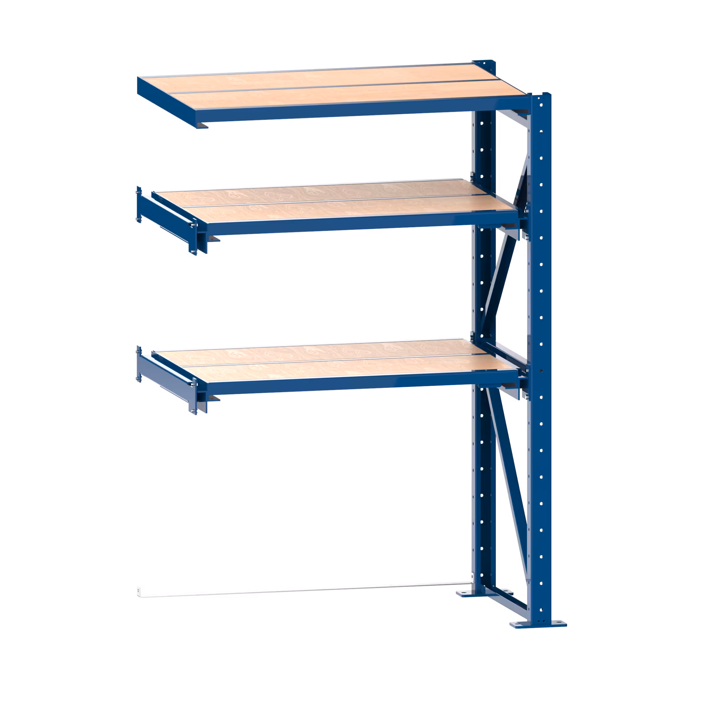 Heavy-duty pull-out shelving systems, disassembled: With 2 pull-out frames for part extension (PE, 65% extension) and 1 fixed frame as top shelf, each including chipboard inserts, 40 mm thick. Can be fitted with side panels, further pull-out and fixed frames, metal covers, siding doors, roller shutters and column guard. Basic unit including 1 diagonal brace for lengthwise stability, 2 side frames, floor anchor and levelling plate set. Add-on unit including 1 side frame, floor anchor and levelling plate set. Hole spacing in the side frame every 100 mm. Specification: steel sheet. Colour: as per colour chart. Note: from the third add-on unit, an additional diagonal brace is required.