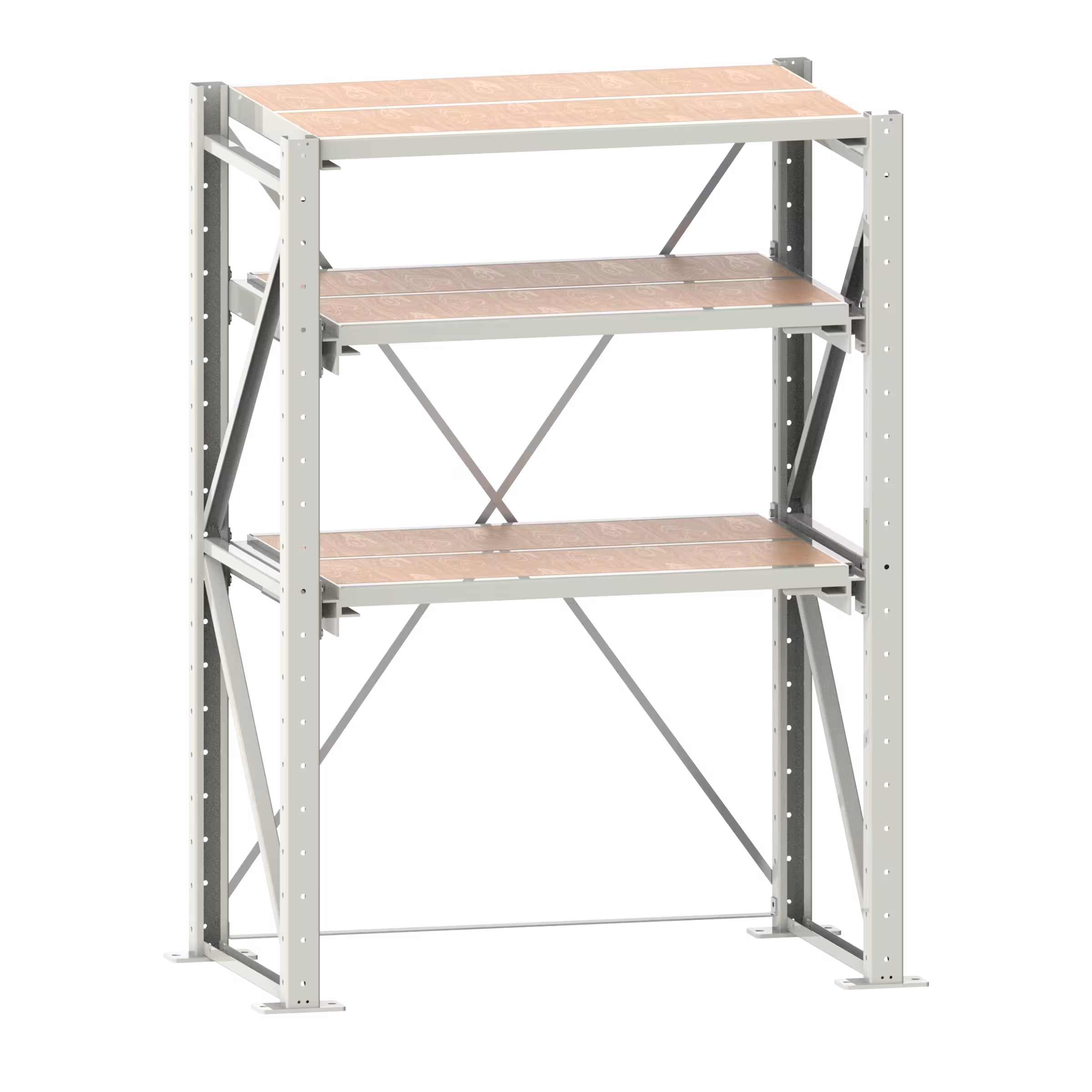 Heavy-duty pull-out shelving systems, disassembled: With 2 pull-out frames for part extension (PE, 65% extension) and 1 fixed frame as top shelf, each including chipboard inserts, 40 mm thick. Can be fitted with side panels, further pull-out and fixed frames, metal covers, siding doors, roller shutters and column guard. Basic unit including 1 diagonal brace for lengthwise stability, 2 side frames, floor anchor and levelling plate set. Add-on unit including 1 side frame, floor anchor and levelling plate set. Hole spacing in the side frame every 100 mm. Specification: steel sheet. Colour: as per colour chart. Note: from the third add-on unit, an additional diagonal brace is required.