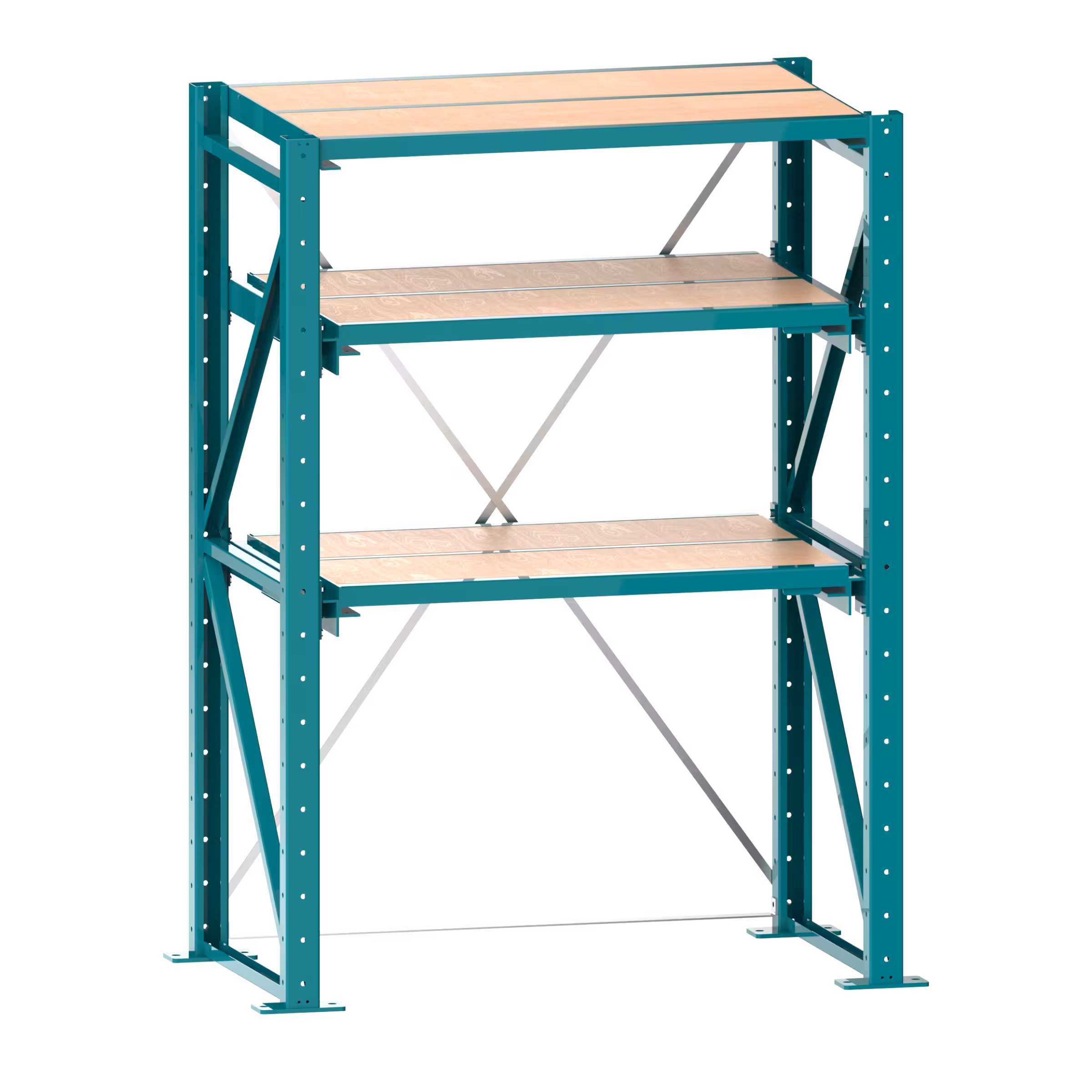 Heavy-duty pull-out shelving systems, disassembled: With 2 pull-out frames for part extension (PE, 65% extension) and 1 fixed frame as top shelf, each including chipboard inserts, 40 mm thick. Can be fitted with side panels, further pull-out and fixed frames, metal covers, siding doors, roller shutters and column guard. Basic unit including 1 diagonal brace for lengthwise stability, 2 side frames, floor anchor and levelling plate set. Add-on unit including 1 side frame, floor anchor and levelling plate set. Hole spacing in the side frame every 100 mm. Specification: steel sheet. Colour: as per colour chart. Note: from the third add-on unit, an additional diagonal brace is required.
