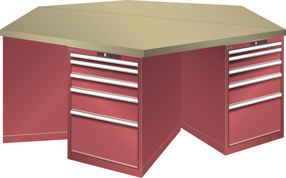 Hexagonal Workbench 27x36E (WxDxH) 2500x2165x840mm 6 x 5 drawers (1x50/2x100/1x150/1x300) 75kg Multiplex AUTO Lock Flame red RAL 3000