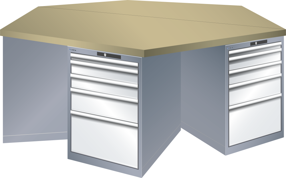 Hexagonal Workbench 27x36E (WxDxH) 2500x2165x840mm 6 x 5 drawers (1x50/2x100/1x150/1x300) 75kg Multiplex AUTO Lock Grey metallic NCS S 6502-B / Light grey RAL 7035