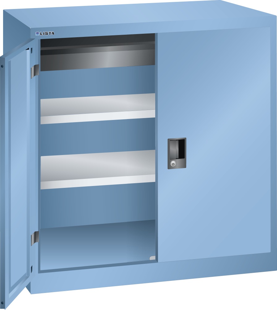 Hinged door cabinets: Depending on the model, the cabinets are equipped with: galvanised adjustable shelves, 30 mm thick, load capacity 60 kg. Pull-out shelves and drawers painted, anthracite grey, RAL 7016, load capacity 50 kg