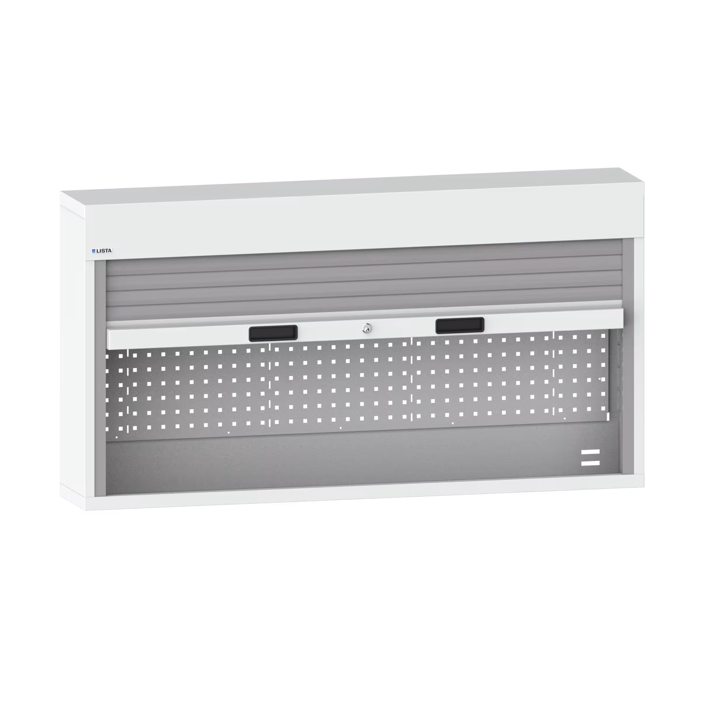 Wall-mounted cabinets with roller shutters: For assembling support pillars. Roller shutters made from aluminium slats and spring balancer, colour similar to white aluminium RAL 9006. Handle with integrated grip plates and closing mechanism KEY Lock. Gentle and safe (self-locking) operation. Including integrated perforated rear panel with square holes 10 x 10 mm and 38 mm apart. Optional: Height-adjustable shelves in 25 mm increments. Cable conduit for use with power modules. Punch-out for electrification and fastening options for power strips and LED lights. Specification: sheet steel. Colour: as per colour chart.