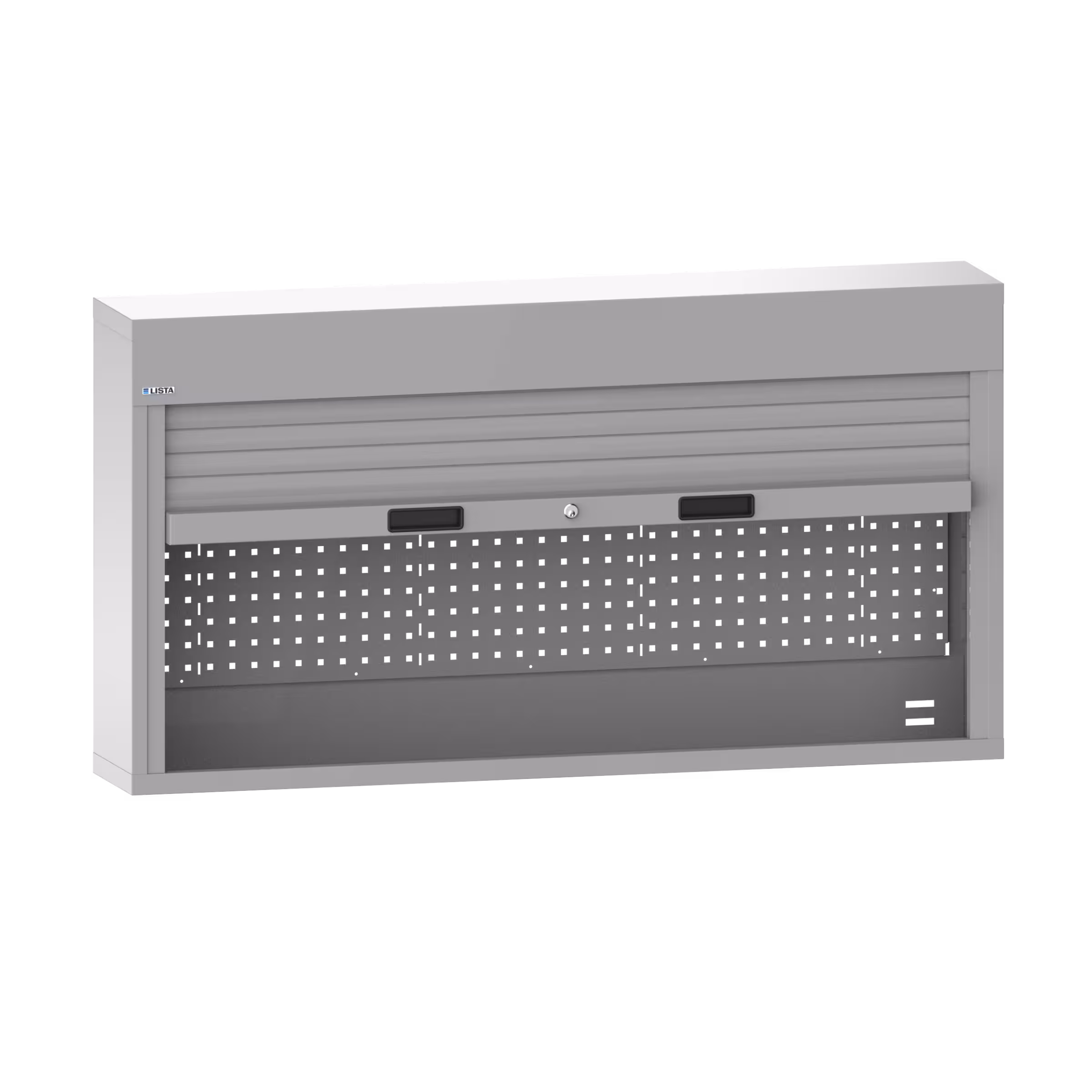 Wall-mounted cabinets with roller shutters: For assembling support pillars. Roller shutters made from aluminium slats and spring balancer, colour similar to white aluminium RAL 9006. Handle with integrated grip plates and closing mechanism KEY Lock. Gentle and safe (self-locking) operation. Including integrated perforated rear panel with square holes 10 x 10 mm and 38 mm apart. Optional: Height-adjustable shelves in 25 mm increments. Cable conduit for use with power modules. Punch-out for electrification and fastening options for power strips and LED lights. Specification: sheet steel. Colour: as per colour chart.