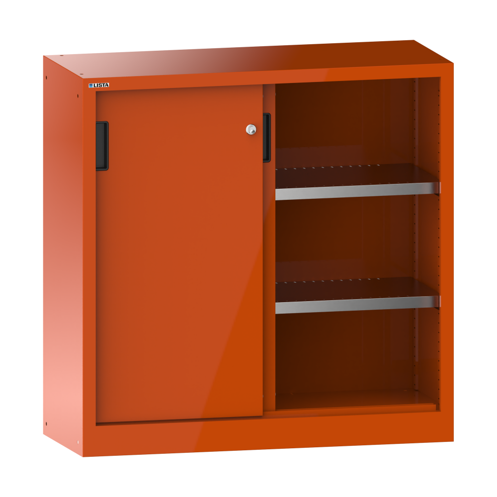 Sliding-door cabinet with 2 solid sheet doors (WxDxH) 1250x400x1000mm 2 shelves KEY Lock Orange RAL 2004
