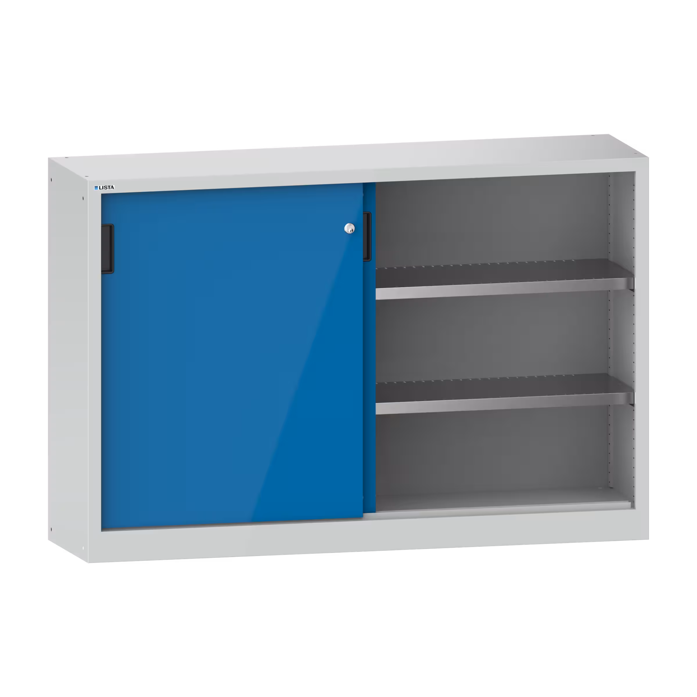 Sliding-door cabinet with 2 solid sheet doors and partition (WxDxH) 1500x400x1000mm 4 shelves KEY Lock Light grey RAL 7035 / Light blue RAL 5012