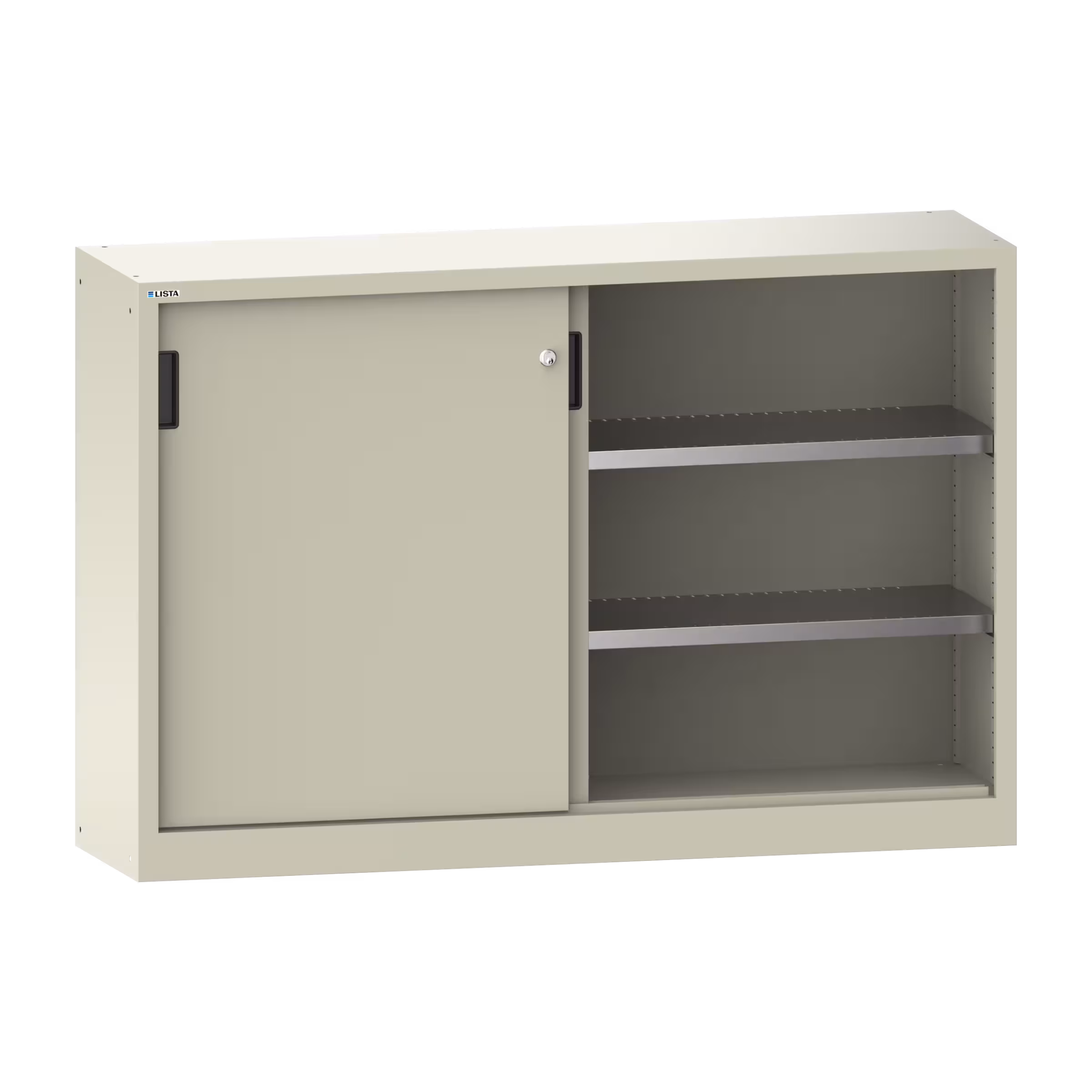 Sliding-door cabinet with 2 solid sheet doors and partition (WxDxH) 1500x400x1000mm 4 shelves KEY Lock Pebble grey RAL 7032