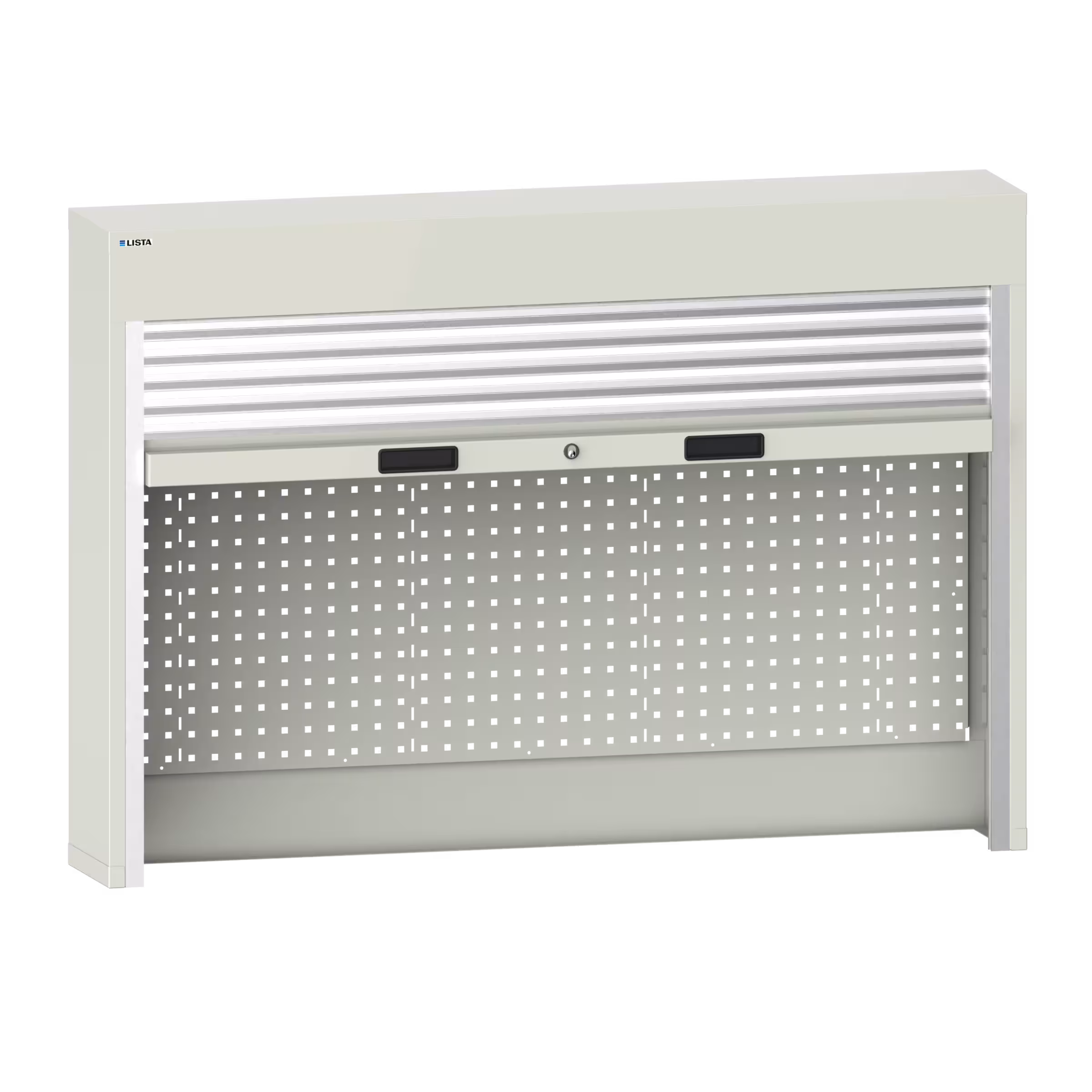 Top-mounted cabinets with roller shutters: Top-mounted cabinets without housing base for direct assembly on the workbench top. Roller shutters made from aluminium slats and spring balancer, colour similar to white aluminium RAL 9006. Handle with integrated grip plates and closing mechanism KEY Lock. Gentle and safe (self-locking) operation. Including integrated perforated rear panel with square holes 10 x 10 mm and 38 mm apart. Optional: Height-adjustable shelves in 25 mm increments. Cable conduit for use with power modules. Punch-out for electrification and fastening options for power strips and LED lights. Specification: sheet steel. Colour: as per colour chart.