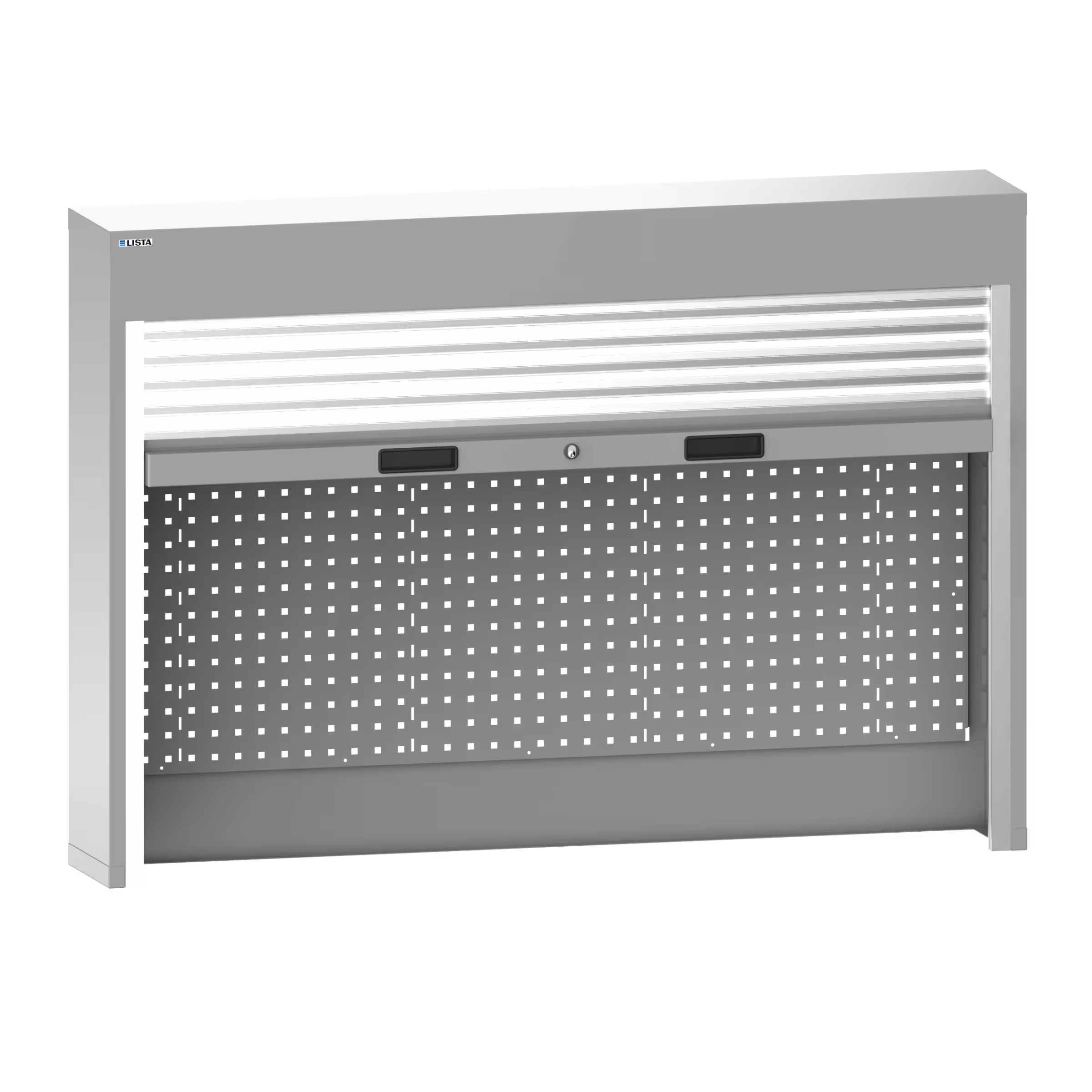 Top-mounted cabinets with roller shutters: Top-mounted cabinets without housing base for direct assembly on the workbench top. Roller shutters made from aluminium slats and spring balancer, colour similar to white aluminium RAL 9006. Handle with integrated grip plates and closing mechanism KEY Lock. Gentle and safe (self-locking) operation. Including integrated perforated rear panel with square holes 10 x 10 mm and 38 mm apart. Optional: Height-adjustable shelves in 25 mm increments. Cable conduit for use with power modules. Punch-out for electrification and fastening options for power strips and LED lights. Specification: sheet steel. Colour: as per colour chart.