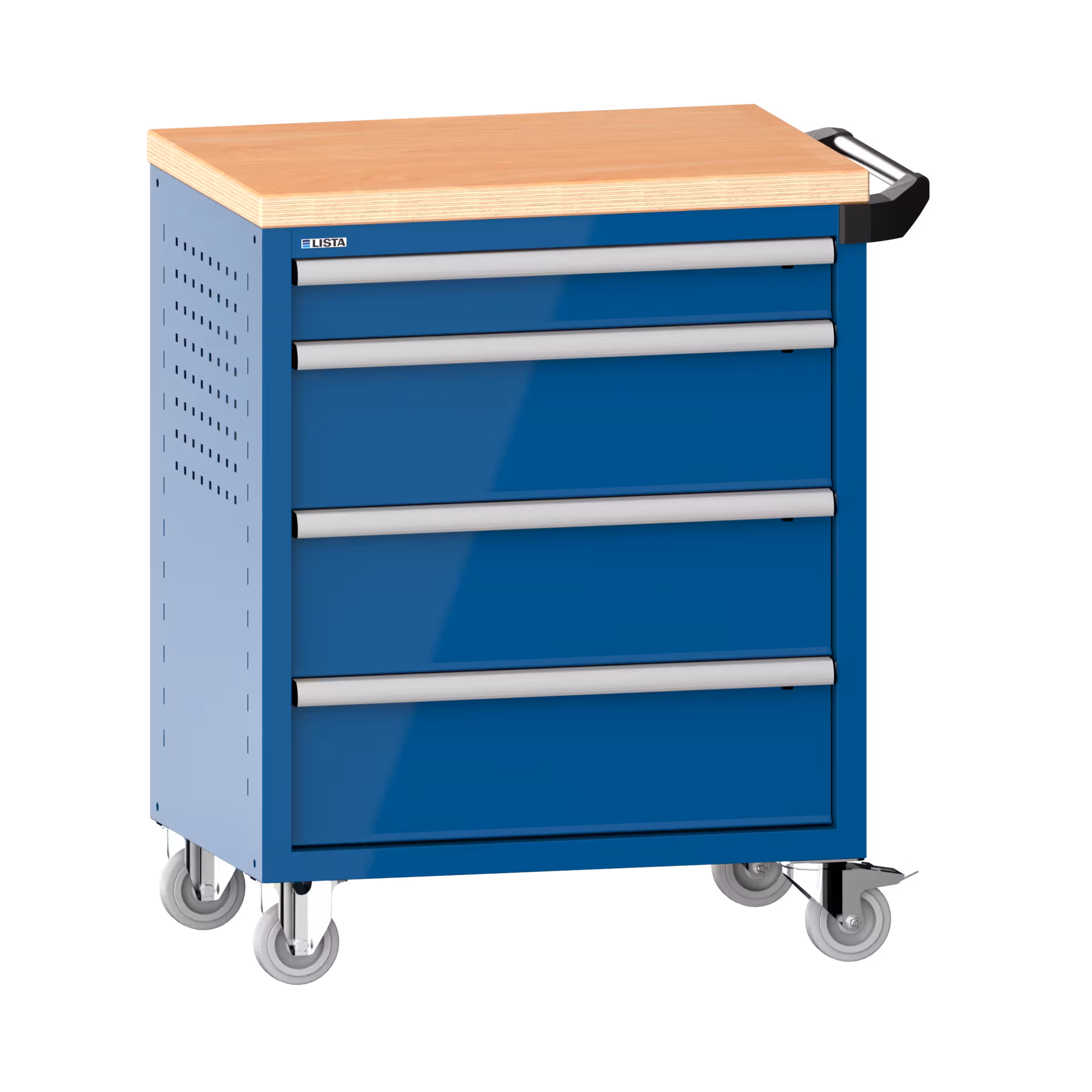 Workplace trolleys 36x27E (WxDxH) 833x525x945mm 4 drawers (1x100/3x200) 40kg with wooden cover safety catch on right KEY Lock Capri blue RAL 5019