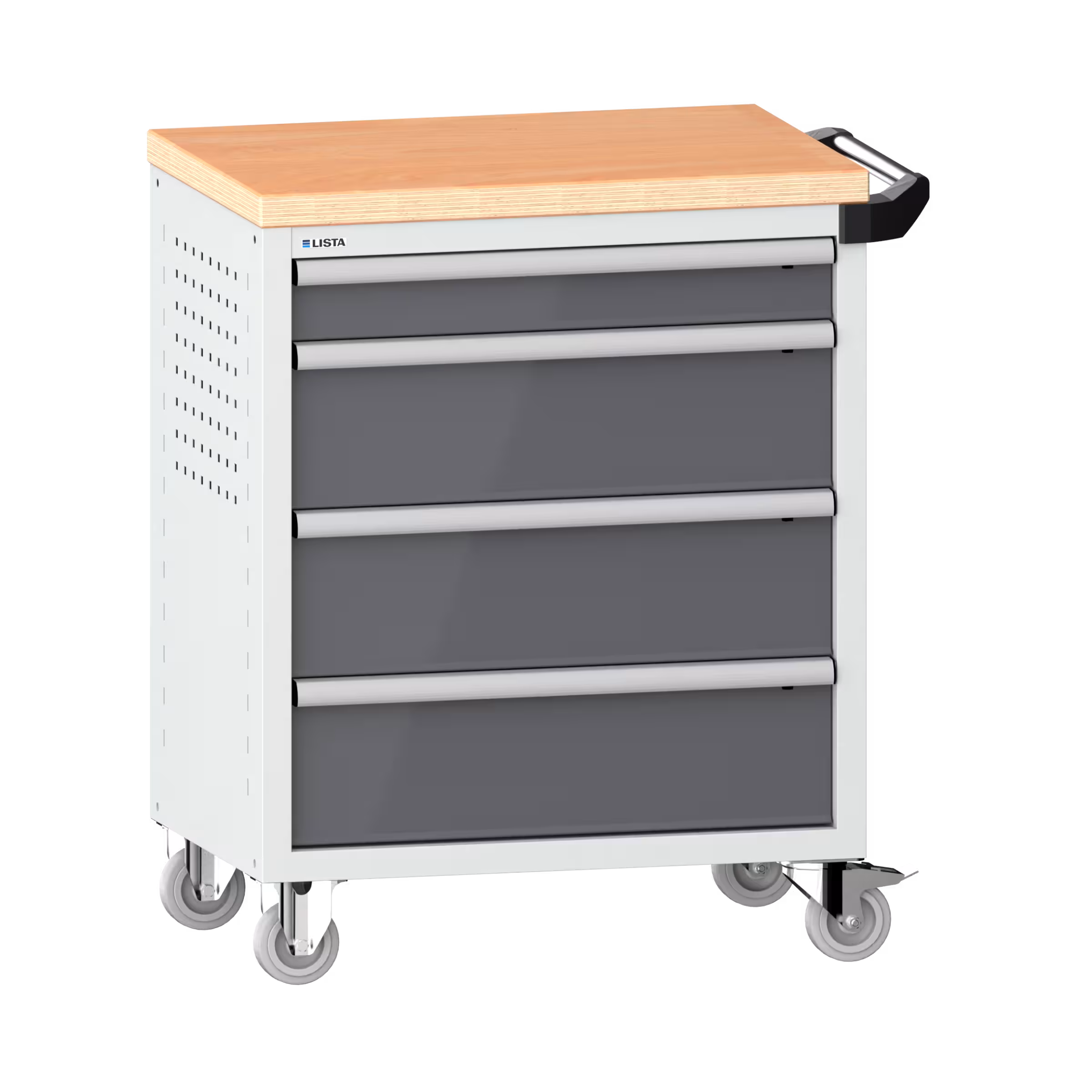 Workplace trolleys 36x27E (WxDxH) 833x525x945mm 4 drawers (1x100/3x200) 40kg with wooden cover safety catch on right KEY Lock Light grey RAL 7035 / Grey metallic NCS S 6502-B