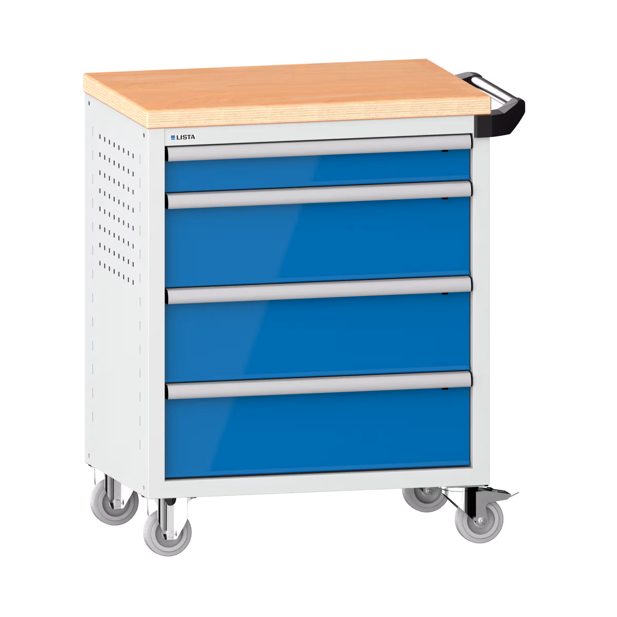 Workplace trolleys 36x27E (WxDxH) 833x525x945mm 4 drawers (1x100/3x200) 40kg with wooden cover safety catch on right KEY Lock Light grey RAL 7035 / Light blue RAL 5012