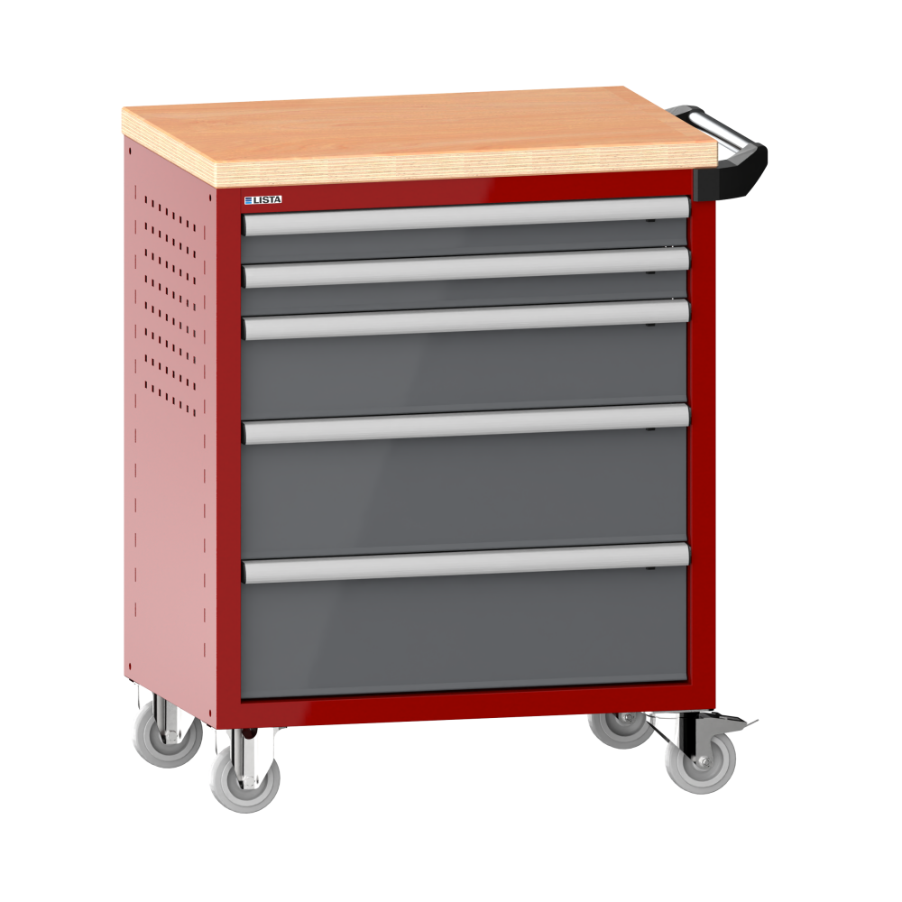 Workplace trolleys 36x27E (WxDxH) 833x525x945mm 5 drawers (2x75/1x150/2x200) 40kg with wooden cover safety catch on right KEY Lock Ruby red RAL 3003 / Grey metallic NCS S 6502-B