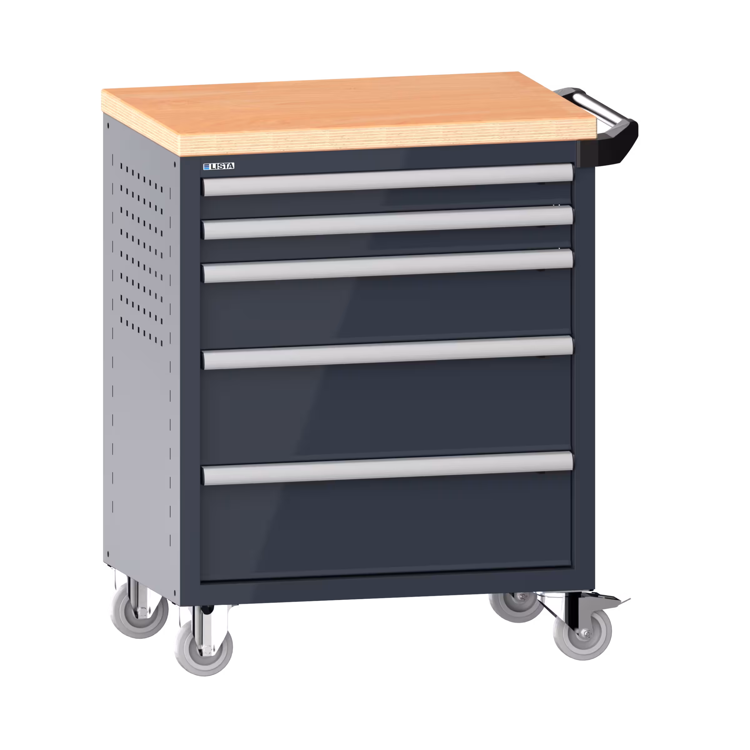 Workplace trolleys 36x27E (WxDxH) 833x525x945mm 5 drawers (2x75/1x150/2x200) 40kg with wooden cover safety catch on right KEY Lock Slate grey RAL 7015