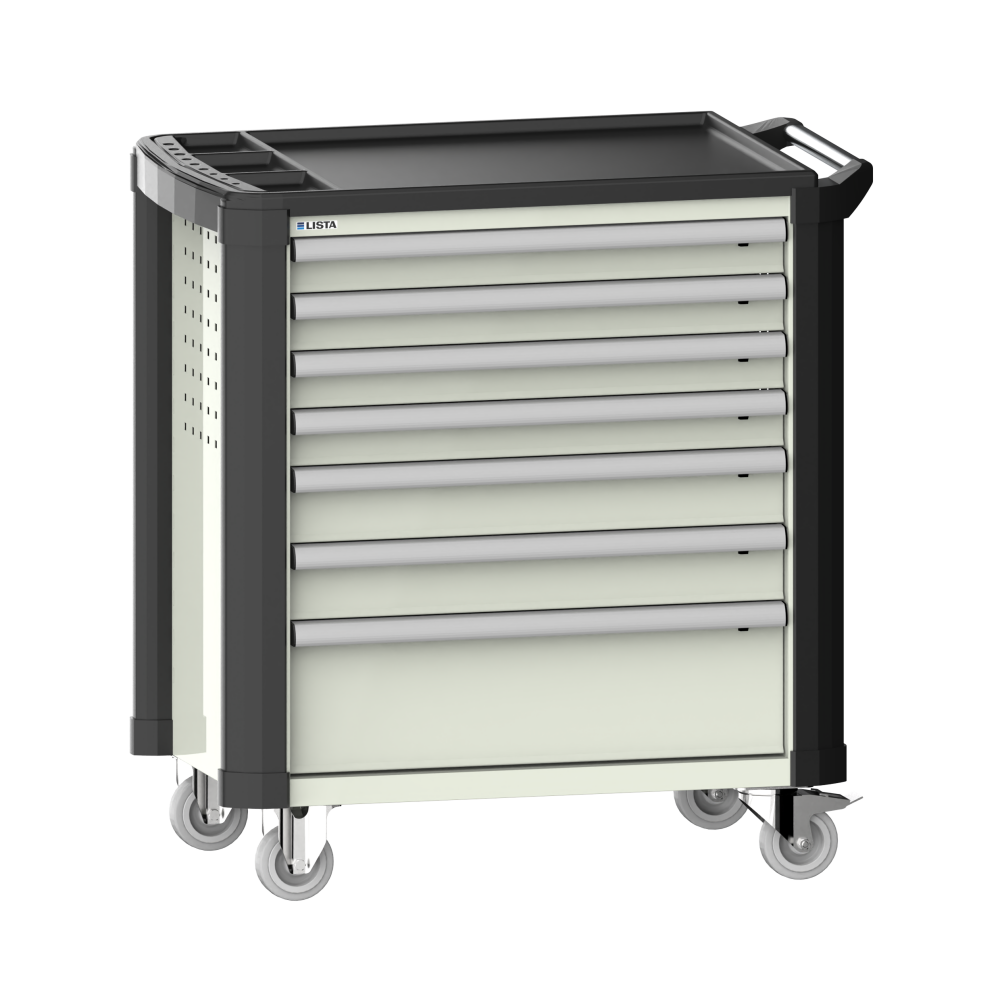 Workplace trolleys 36x27E (WxDxH) 894x525x928mm 7 drawers (4x75/2x100/1x200) 40kg with plastic cover and edge protection safety catch on right KEY Lock Grey-white RAL 9002