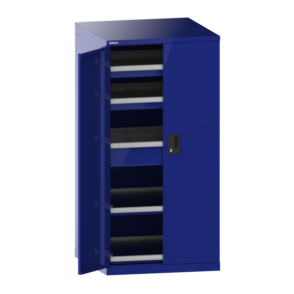 Armario de cajones con puertas batientes 36x36E (AxPxA) 717x753x1450mm 3 cajones (75kg), 2 estantes extensibles (75kg) KEY Lock Azul ultramar RAL 5002