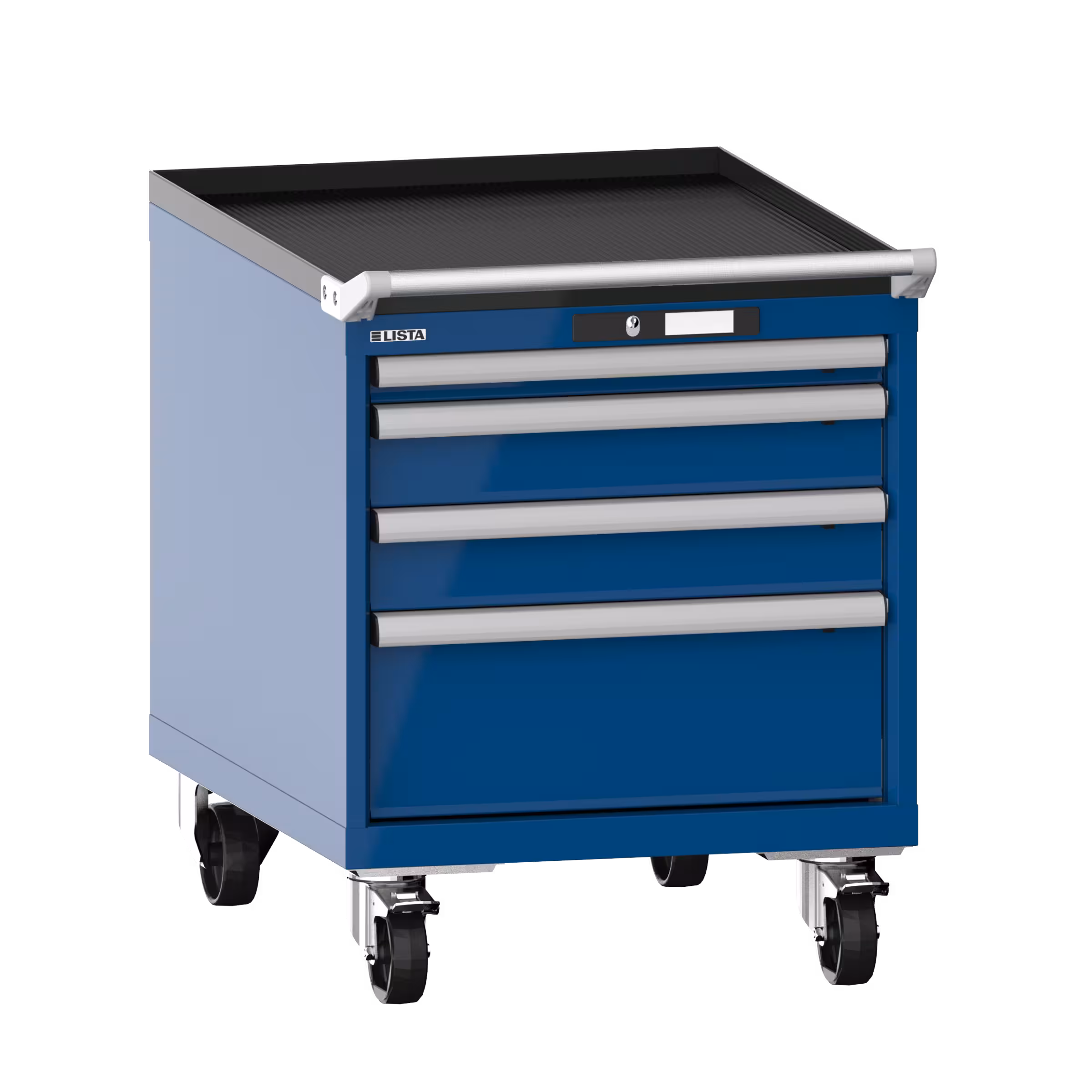 Armario de cajones móviles 27x36E (AxPxA) 564x725x723mm 4 cajones (1x50/2x100/1x200) 75kg ruedas de nailon Ø100mm KEY Lock Azul señales RAL 5005
