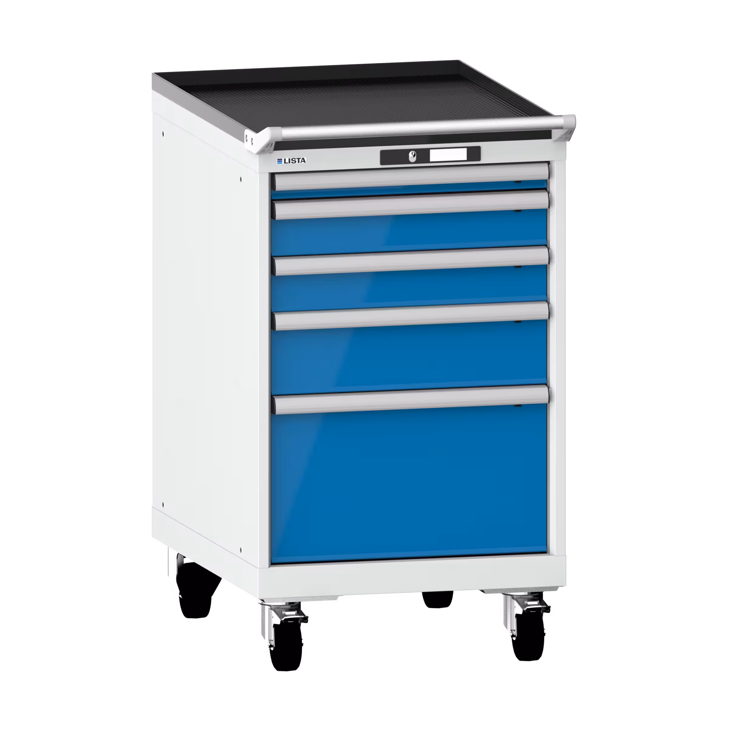 Armario de cajones móviles 27x36E (AxPxA) 564x725x990mm 5 cajones (1x50/2x100/1x150/1x300) 75kg ruedas de nailon Ø100mm KEY Lock Gris luminoso RAL 7035 / Azul luminoso RAL 5012