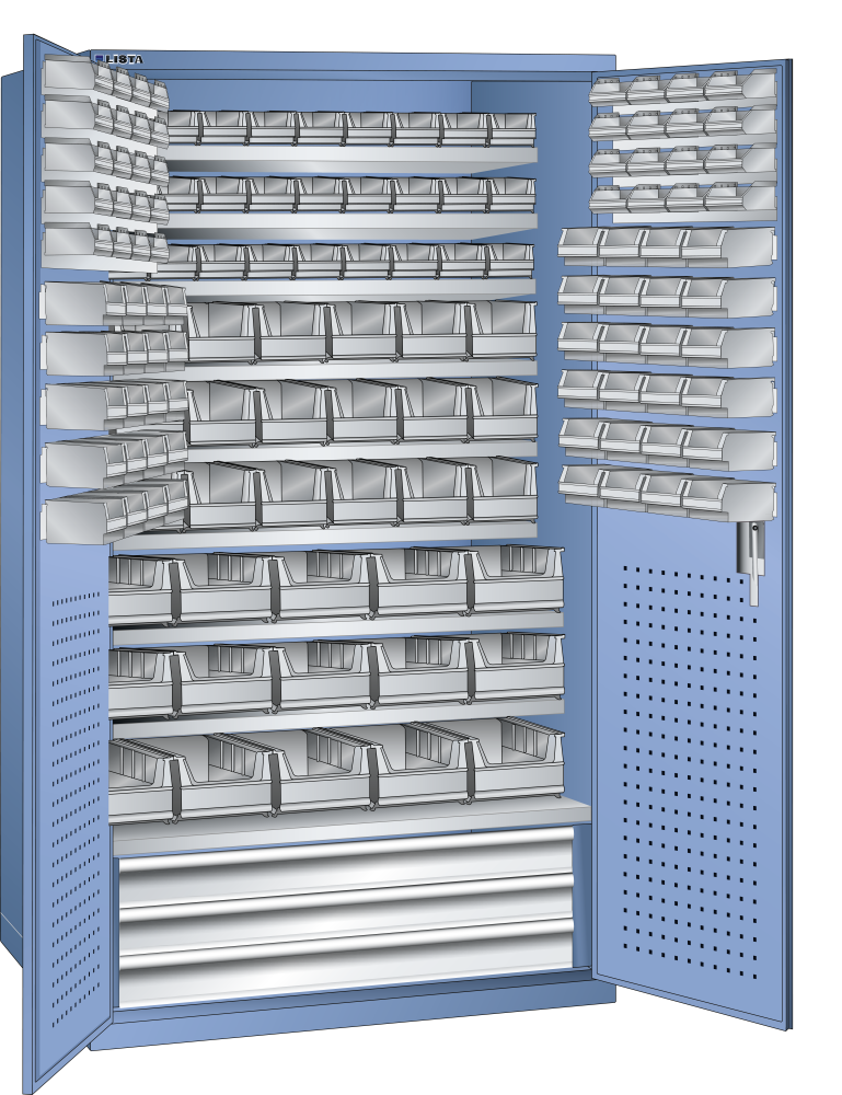 Armario de gran capacidad: construcción de chapa de acero soldada y de alta calidad. Puertas batientes, interior con paredes perforadas o de ranuras para colgar cajas plásticas y ganchos para paredes perforadas, ángulo de apertura de la puerta: 180 grados. Estantes regulables galvanizados, 25 mm de espesor, cajones con una extensión total y deslizamiento silencioso: altura frontal de 100 mm, capacidad de carga de 75 kg, extensión total, en gris luminoso, RAL 7035. Contenedor plástico de polipropileno. Con cerradura Key Lock, CODE o RFID Lock a elegir. Color: según la carta de colores.