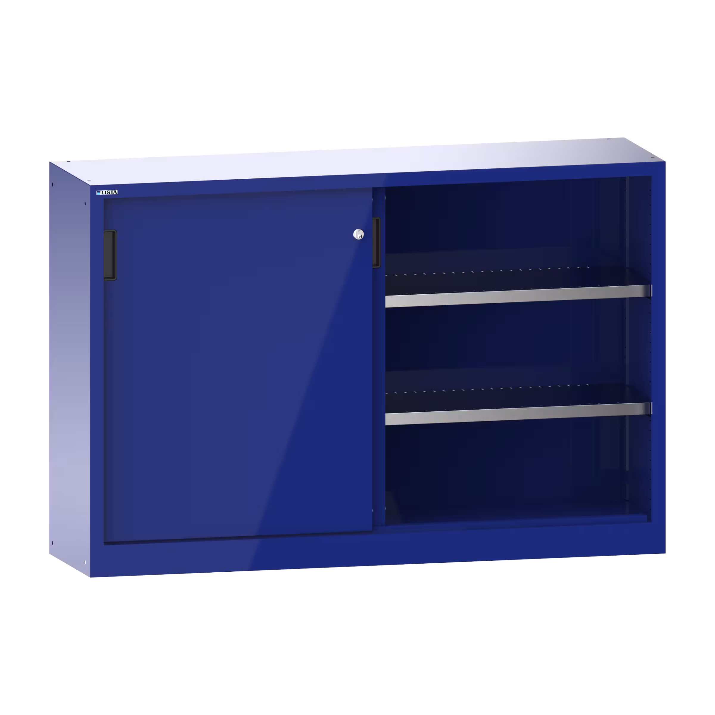 Armario de puerta corredera con 2 puertas de chapa maciza y panel de separación (AxPxA) 1500x400x1000mm 4 estantes regulables KEY Lock Azul ultramar RAL 5002