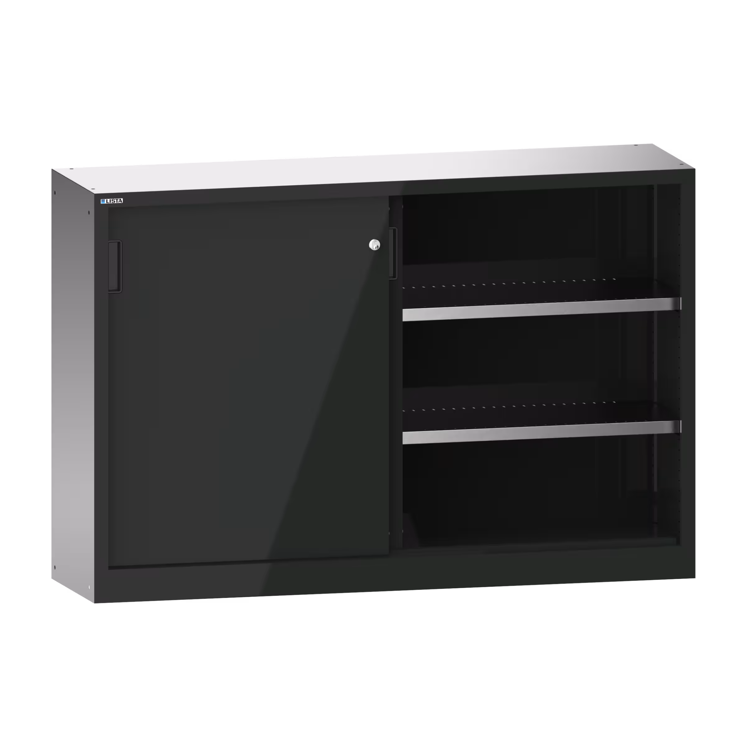 Armarios de puertas correderas: los armarios están equipados según el modelo con: estantes regulables galvanizados, 30 mm grosor, capacidad de carga 60 kg. Los estantes extensibles y los cajones están lacados, gris antracita, RAL 7016, capacidad de carga de 50 kg