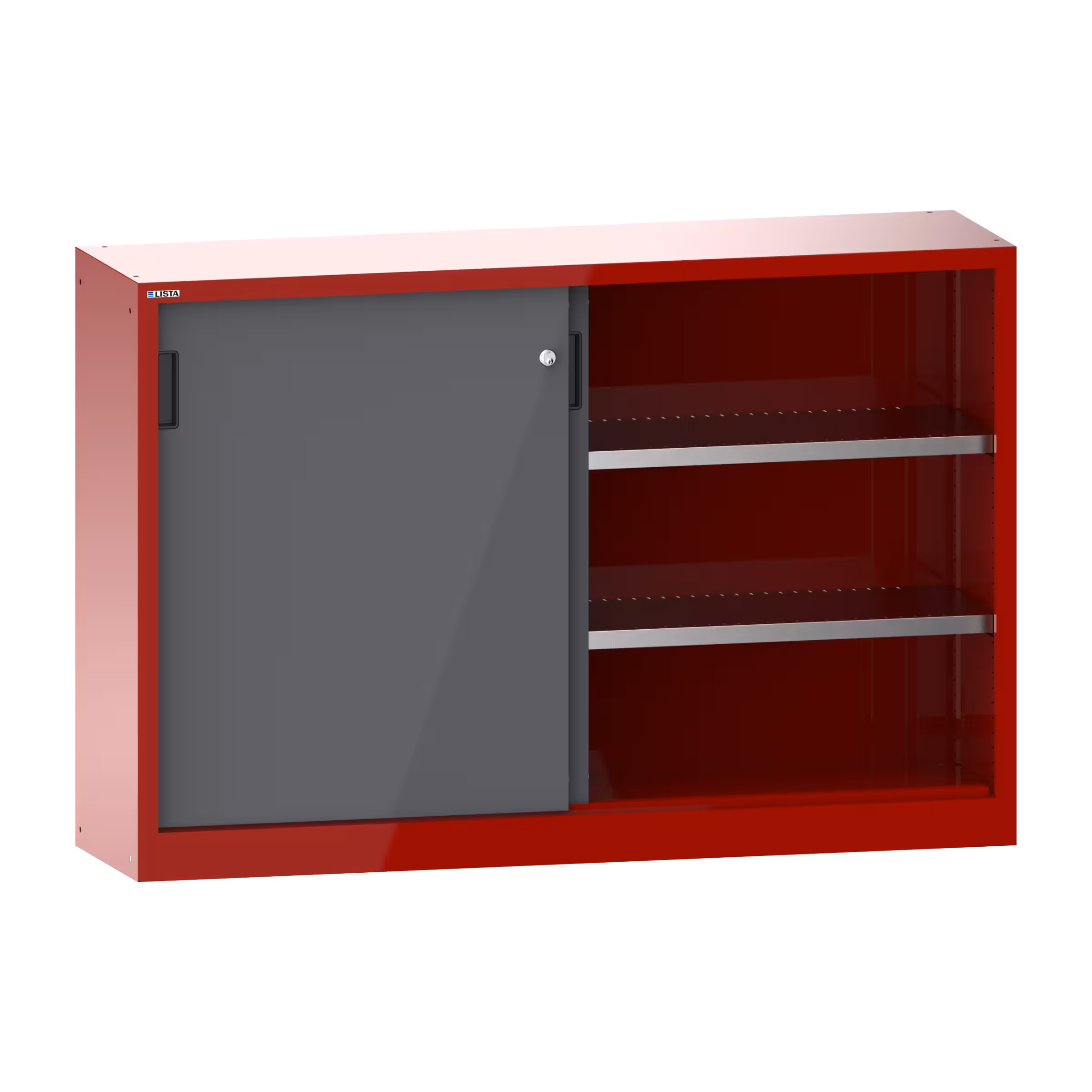 Armario de puerta corredera con 2 puertas de chapa maciza y panel de separación (AxPxA) 1500x400x1000mm 4 estantes regulables KEY Lock Rojo rubí RAL 3003 / Gris metalizado NCS S 6502-B