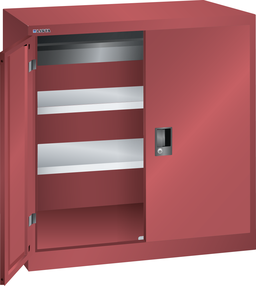 Armarios de puertas batientes: los armarios están equipados según el modelo con: estantes regulables galvanizados, 30 mm grosor, capacidad de carga 60 kg. Los estantes extensibles y los cajones están lacados, gris antracita, RAL 7016, capacidad de carga de 50 kg