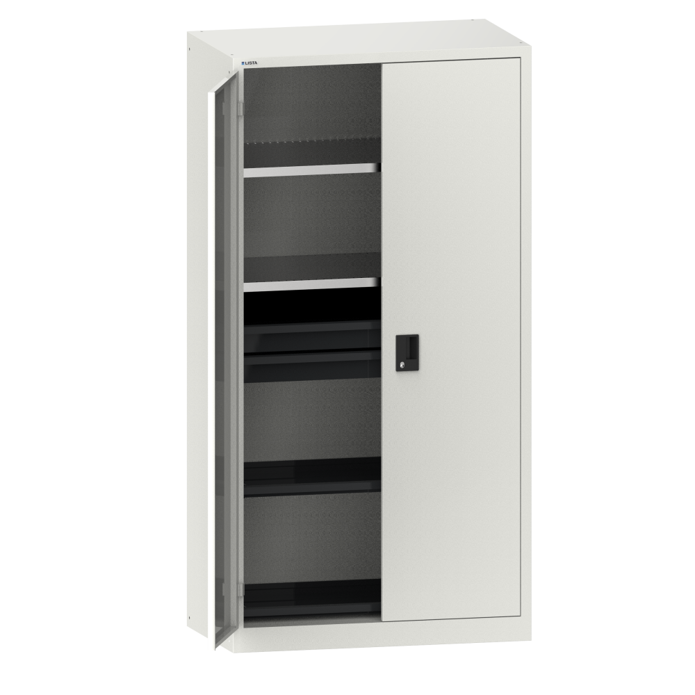 Armario de puertas batientes con 2 puertas de chapa maciza bisagra (AxPxA) 1000x580x1950mm 2 estantes regulables, 3 cajones, 2 estantes extensibles RFID Lock Blanco puro RAL 9010