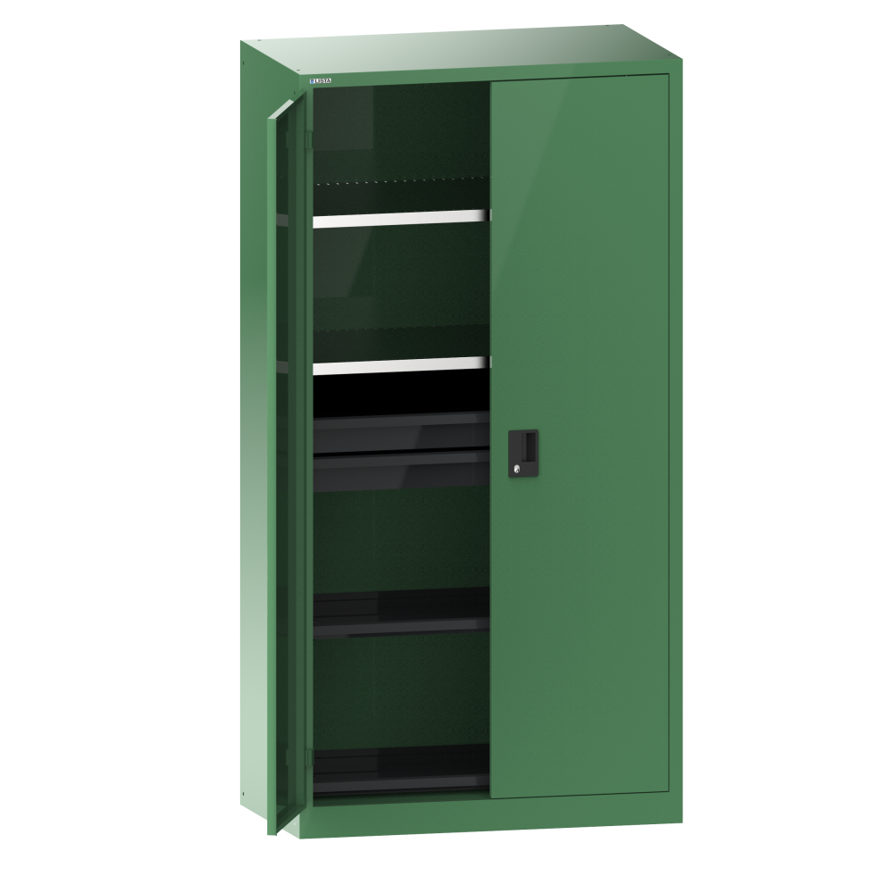 Armario de puertas batientes con 2 puertas de chapa maciza bisagra (AxPxA) 1000x580x1950mm 2 estantes regulables, 3 cajones, 2 estantes extensibles RFID Lock Verde reseda RAL 6011