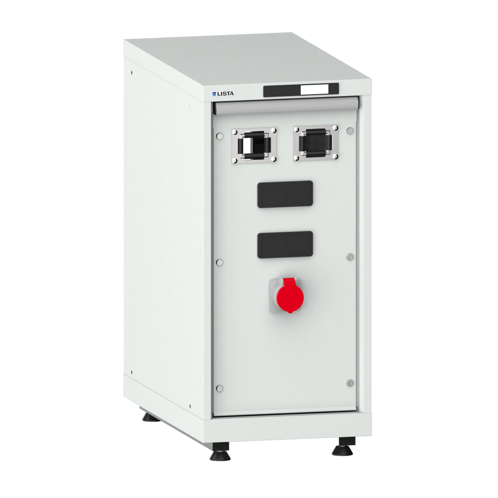 Armario para suministro de medios Compact: Apto para el montaje de enrolladores de manguera para aire comprimido y electricidad. Concebido para la posterior colocación de 2 módulos de energía. Incl. enchufe de 400V. Advertencia: Sin bandeja de goteo: así se evita que haya corriente en el mismo armario en que está el líquido.