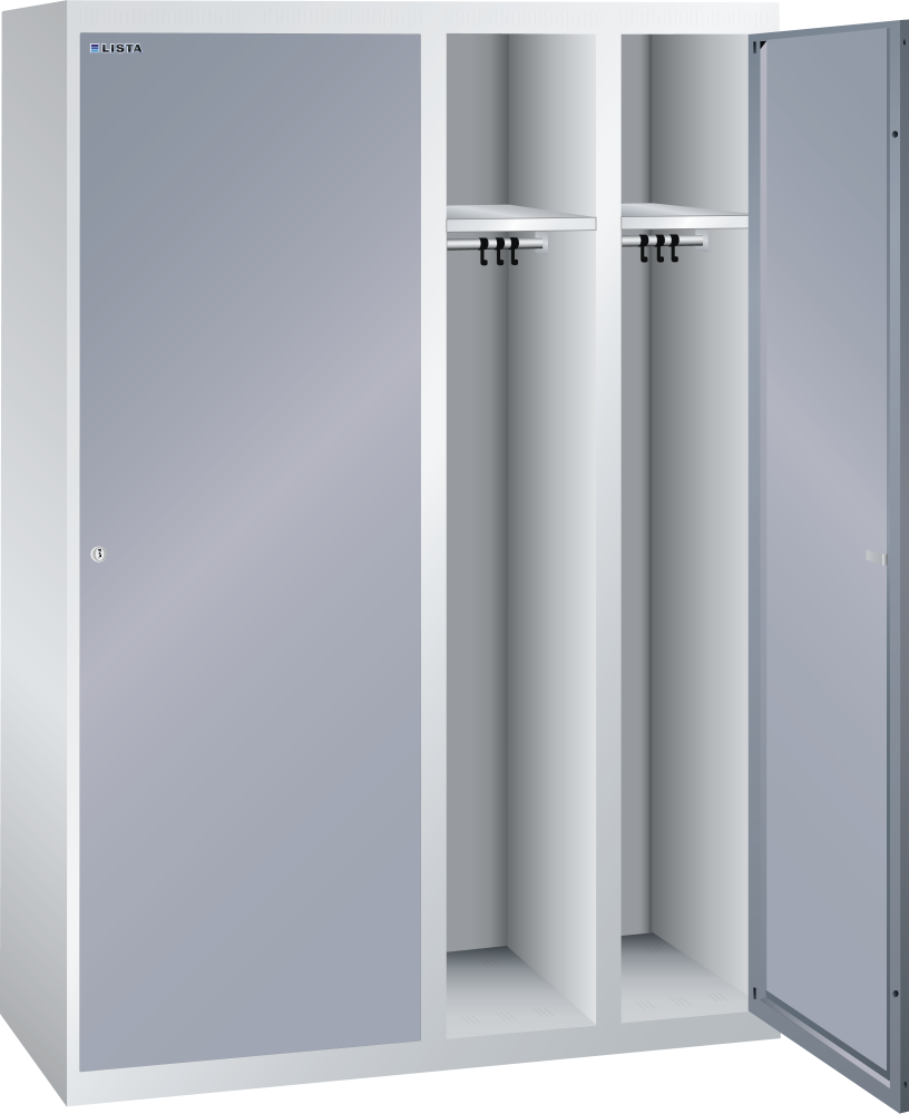 Armarios guardarropa: los armarios guardarropa están equipados según el compartimento y modelo con: puerta de chapa maciza batiente enclavada, superficie lisa o con módulo perforado para una ventilación adicional (2 compartimento de cierre / 1 cerradura para 2 compartimentos), balda para sombreros, perchero con tres ganchos de ropa desplazables, un portatoallas.