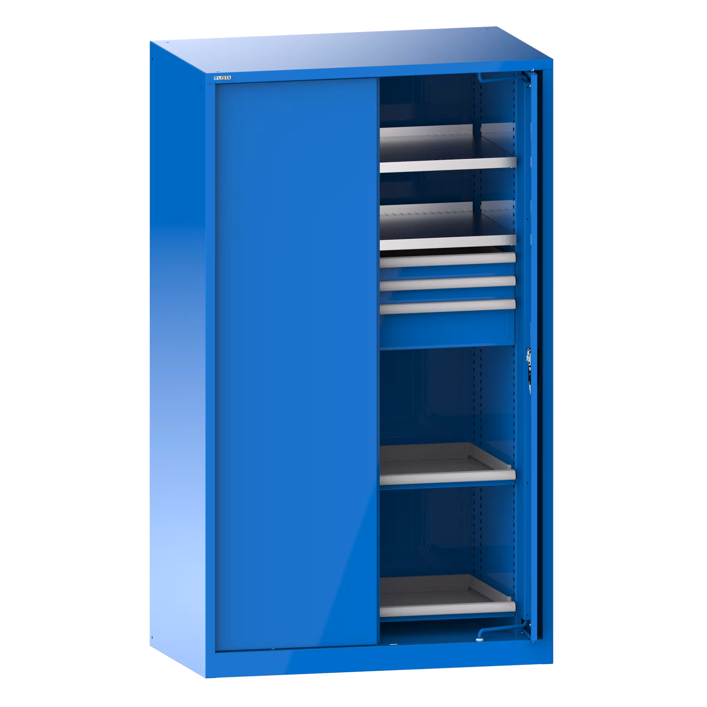 Armario para carga pesada con 2 puertas giratorias de chapa maciza 54x27E (AxPxA) 1146x690x1950mm 2 estantes regulables, 3 cajones, 2 estantes extensibles KEY Lock Azul celeste RAL 5015