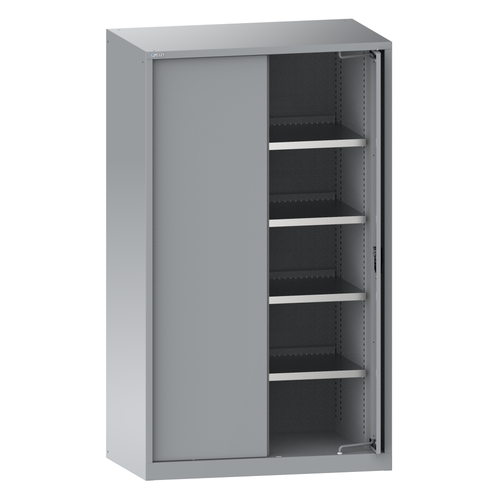 Armarios para cargas pesadas con puertas giratorias. Los armarios están equipados con: estantes regulables galvanizados, 33 mm de espesor, estantes extensibles y cajones lacados generalmente de color gris, NCS 4502-B. Puertas giratorias con remate de una pieza, opcionalmente de chapa maciza o con ventanas. Colocadas en estribos de bisagra, área de giro de 90 grados, el saliente de las puertas abiertas es de 85 mm. Un dispositivo de estabilización de cajones garantiza la estabilidad mediante el bloqueo individual de cajones. Posibilidad de cierres KEY Lock, CODE Lock o RFID Lock.