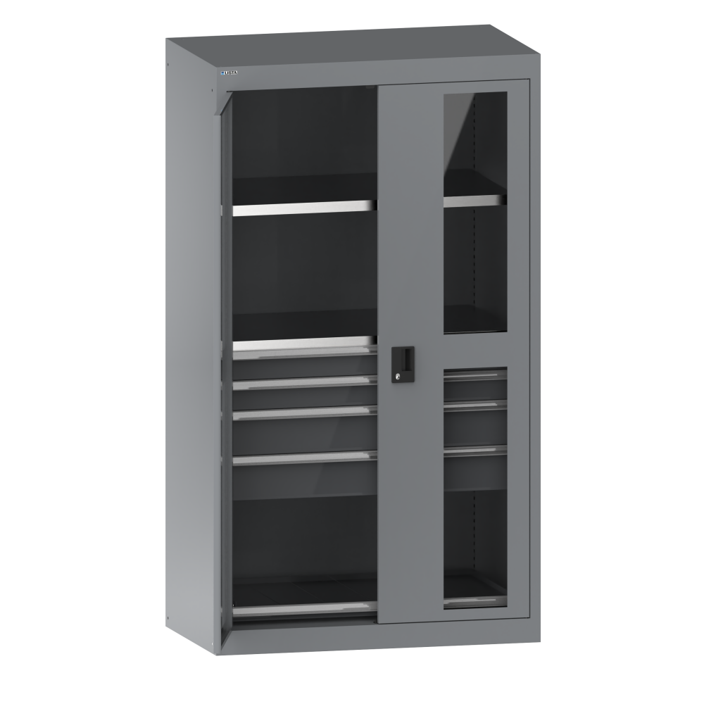 Armario para carga pesada con puertas batientes con ventanas 54x27E (AxPxA) 1100x641x1950mm 2 estantes regulables, 4 cajones, 1 estante extensible RFID Lock Gris cenzia NCS S 4502-B