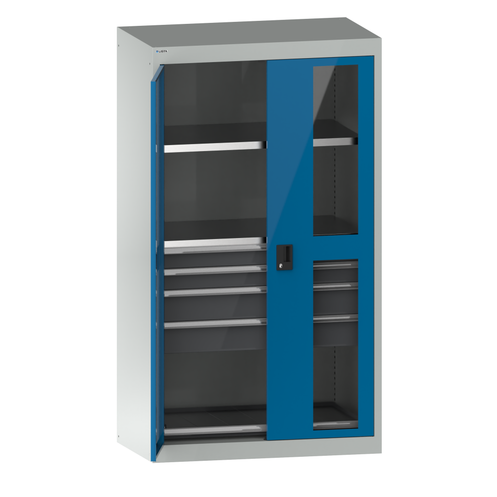 Armario para carga pesada con puertas batientes con ventanas 54x27E (AxPxA) 1100x641x1950mm 2 estantes regulables, 4 cajones, 1 estante extensible RFID Lock Gris luminoso RAL 7035 / Azul luminoso RAL 5012