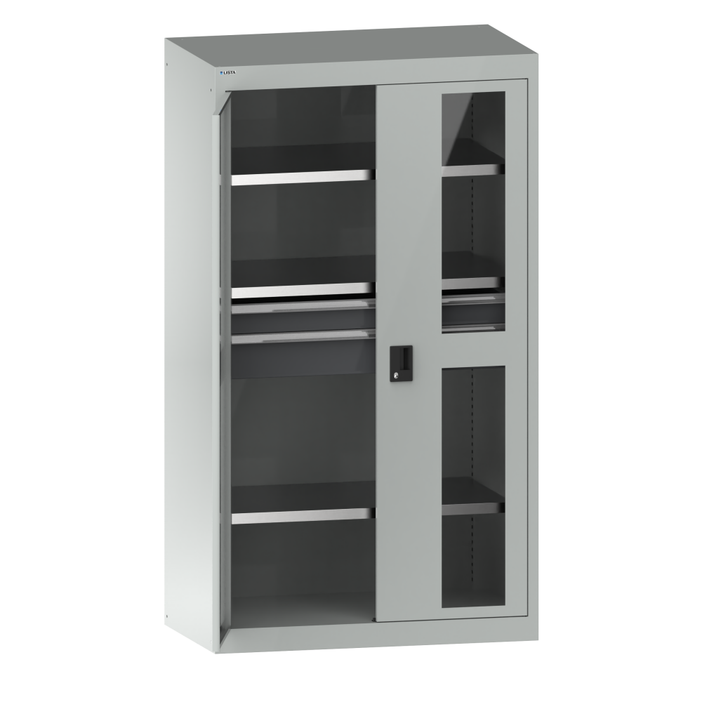 Armario para carga pesada con puertas batientes con ventanas 54x27E (AxPxA) 1100x641x1950mm 3 estantes regulables, 2 cajones KEY Lock Gris luminoso RAL 7035