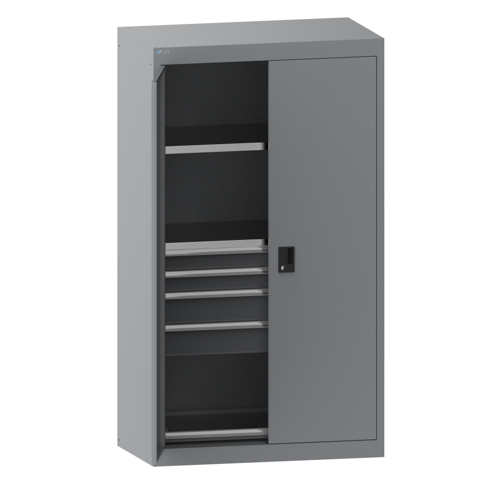 Armarios para cargas pesadas con puertas batientes. Los armarios están equipados con: estantes regulables galvanizados, 35 mm de espesor, estantes extensibles y cajones lacados generalmente de color gris, NCS 4502-B. Puertas batientes con remate de una pieza, opcionalmente de chapa maciza o con ventanas. Posibilidad de cierres KEY Lock, CODE Lock o RFID Lock.