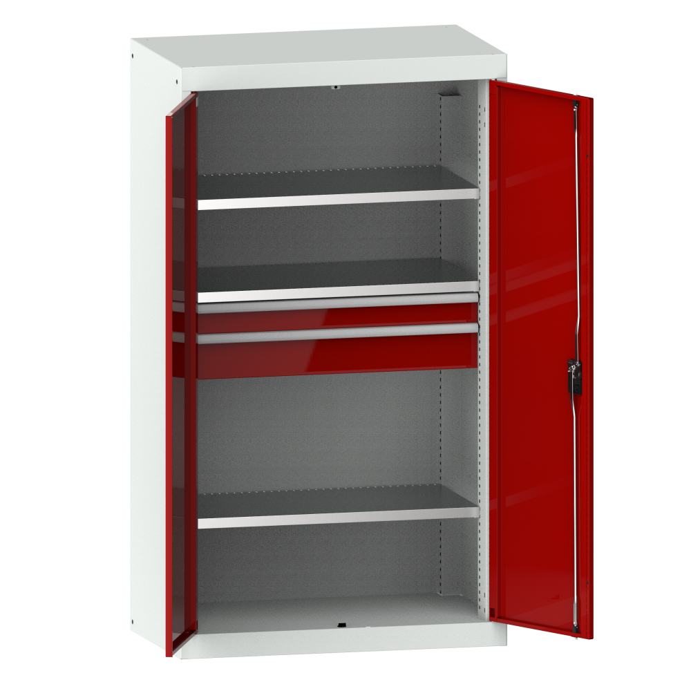 Armario para carga pesada con puertas batientes de chapa maciza 54x27E (AxPxA) 1100x641x1950mm 3 estantes regulables, 2 cajones RFID Lock Gris luminoso RAL 7035 / Rojo rubí RAL 3003