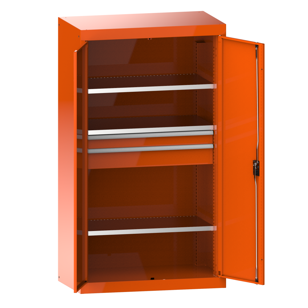 Armario para carga pesada con puertas batientes de chapa maciza 54x27E (AxPxA) 1100x641x1950mm 3 estantes regulables, 2 cajones RFID Lock Naranja puro RAL 2004