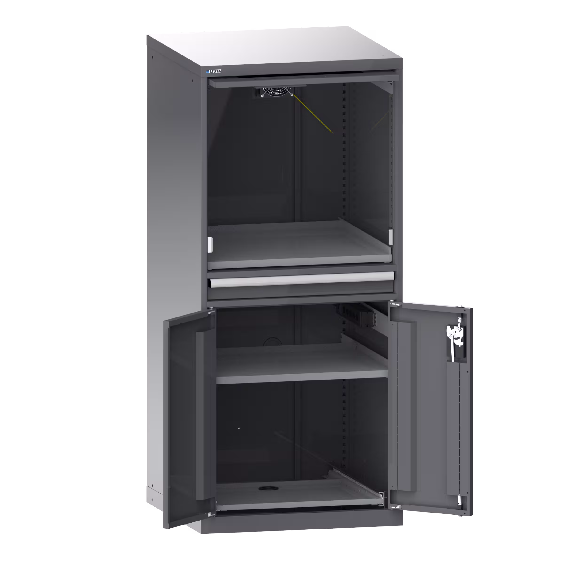 Armarios para ordenador: El ordenador, el hardware y el software se deben proteger del polvo, la suciedad y el acceso no autorizado en el área de la producción. Con el armario para ordenador de LISTA, se dispone de una solución segura y probada.