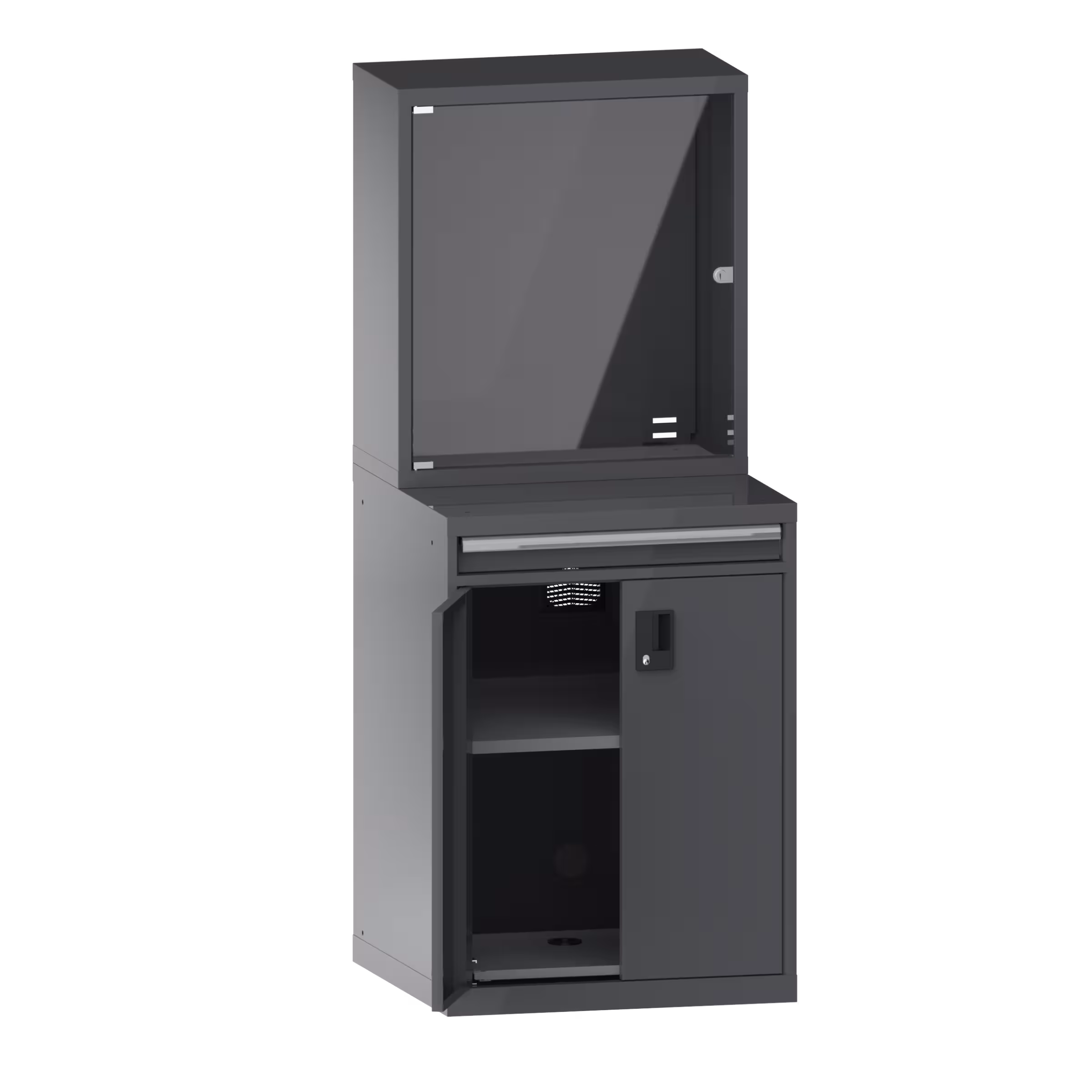 Armarios para ordenador: El ordenador, el hardware y el software se deben proteger del polvo, la suciedad y el acceso no autorizado en el área de la producción. Con el armario para ordenador de LISTA, se dispone de una solución segura y probada.
