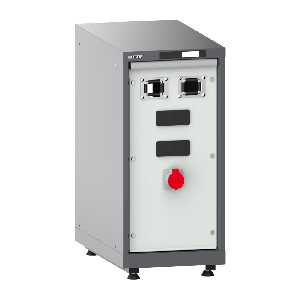 Armario para suministro de medios Compact: Apto para el montaje de enrolladores de manguera para aire comprimido y electricidad. Concebido para la posterior colocación de 2 módulos de energía. Incl. enchufe de 400V. Advertencia: Sin bandeja de goteo: así se evita que haya corriente en el mismo armario en que está el líquido.