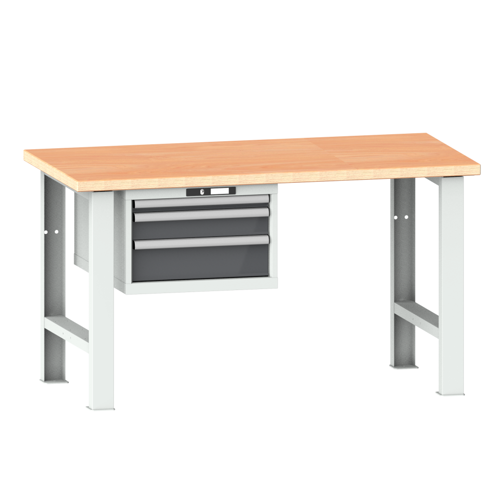 Bancos de trabajo: con encimera de multiplex o haya, incluidos premontaje y material de fijación. Armario de cajones que se puede montar tanto a la derecha como a la izquierda.