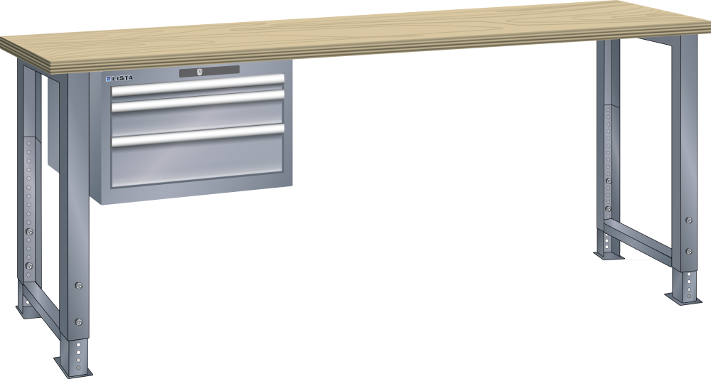 Bancos de trabajo: con encimera de multiplex o haya, incluidos premontaje y material de fijación. Armario de cajones que se puede montar tanto a la derecha como a la izquierda.