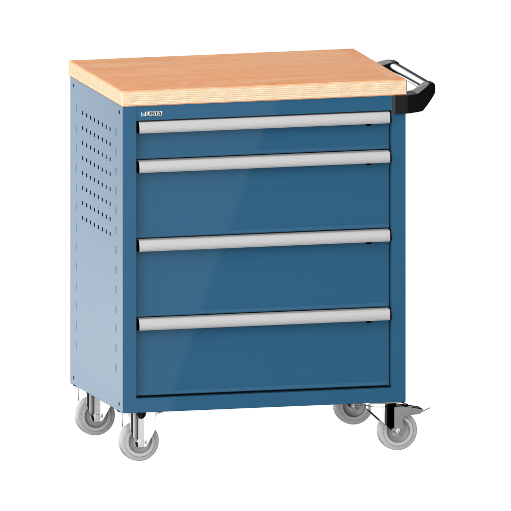 Carro de taller 36x27E (AxPxA) 833x525x945mm 4 cajones (1x100/3x200) 40kg con cubierta de madera de multiplex retén de seguridad sencillo a la derecha KEY Lock Azul brillante RAL 5007